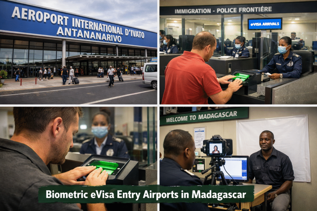 Madagascar eVisa holders are generally processed through major international entry points where immigration facilities include biometric capture (such as fingerprint and photo verification) during arrival.