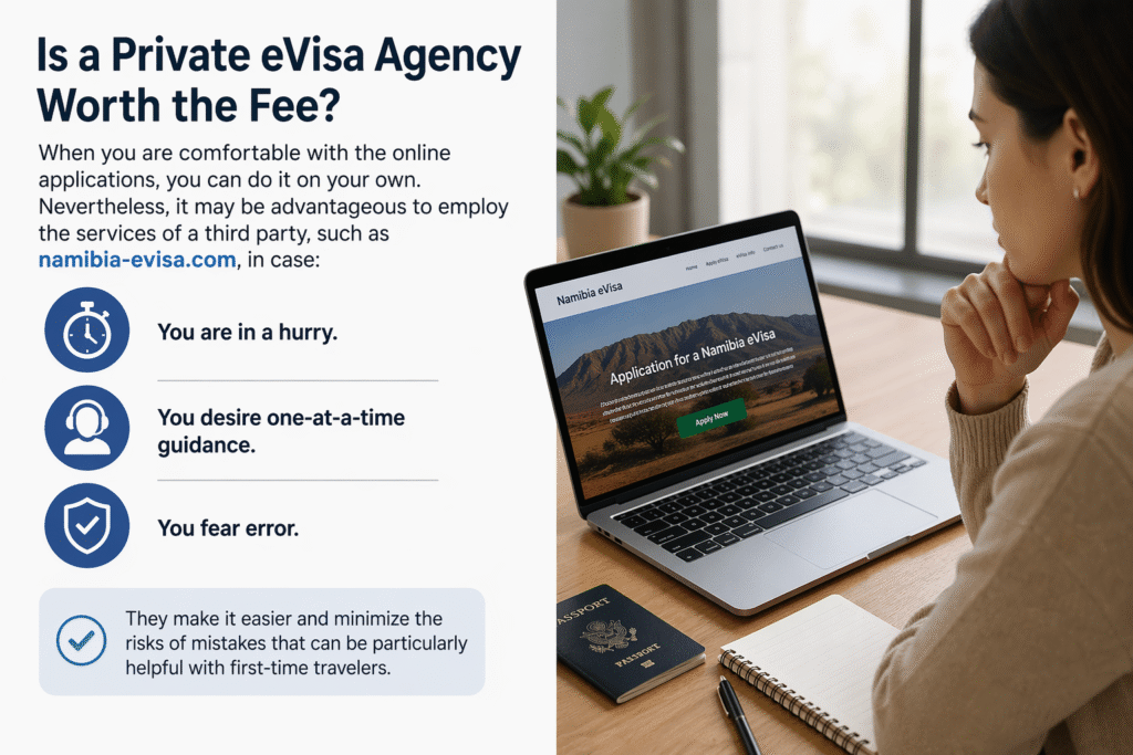 When you are comfortable with the online applications, you can do it on your own. Nevertheless, it may be advantageous to employ the services of a third party, such as namibia-evisa.com, in case: